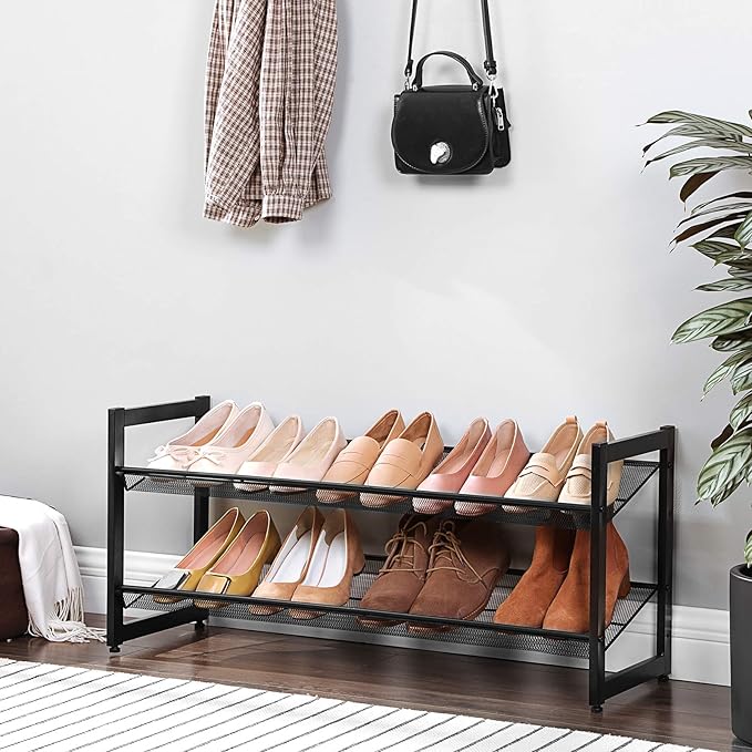 - [Adjustable Shelf – Set It up Your Way] The inclination of our shoe organizer rack can be adjusted to flat or angle according to your preference. The dense, metal mesh shelves and baffle design prevent high heels from falling for easier access to shoes